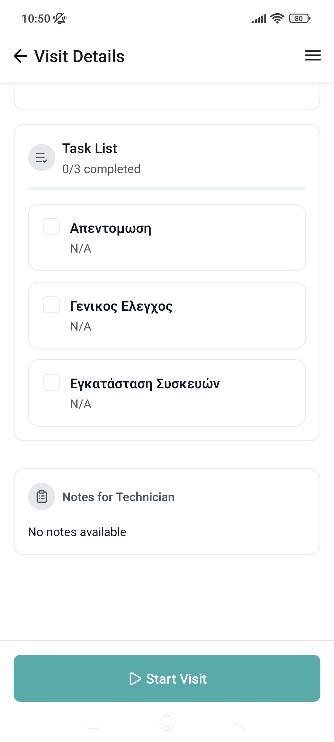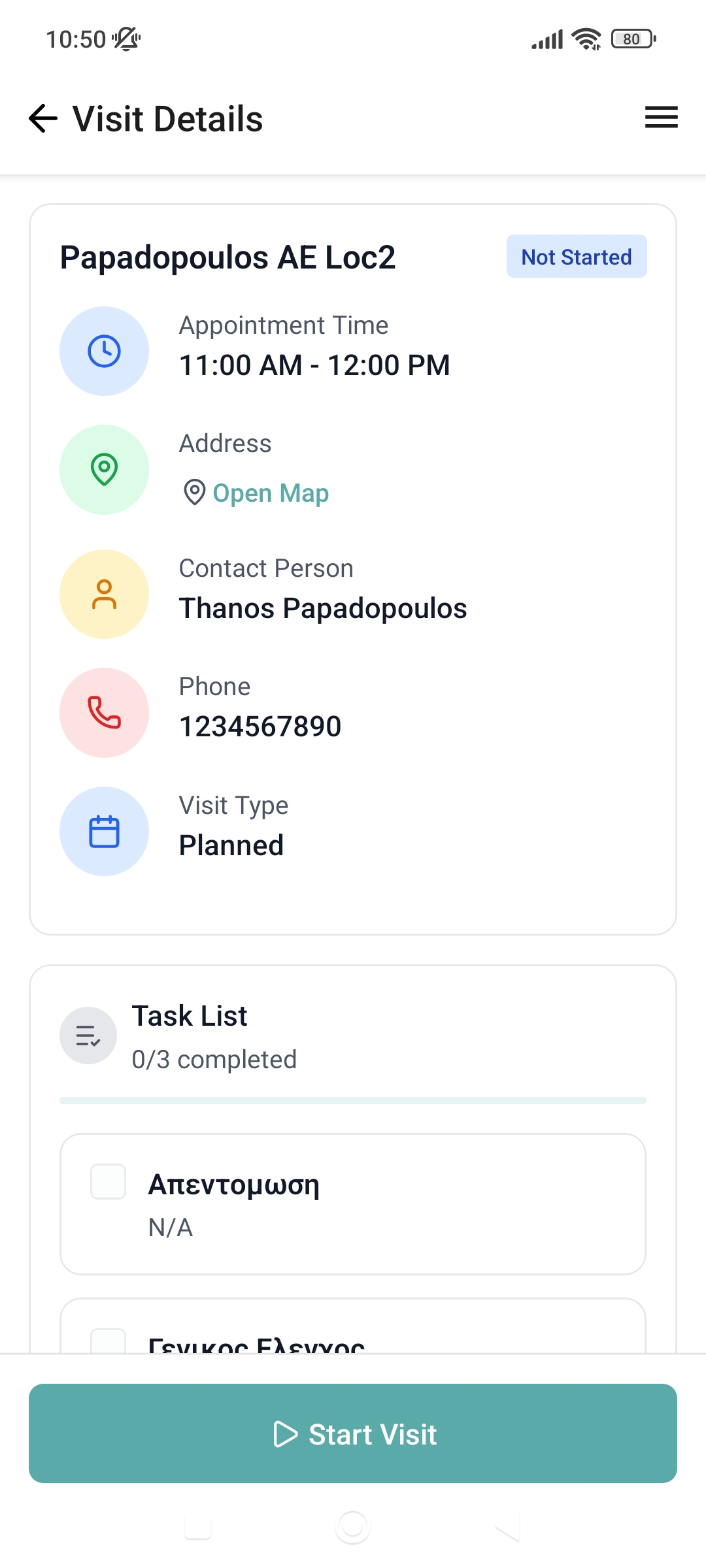 After clicking on a visit, you will be taken to this screen. The Visit Details Screen includes various general information about the visit and, depending on the status of the visit, for example, upcoming, in progress etc, it is possible to perform specific actions by clicking the button at the bottom of the screen.