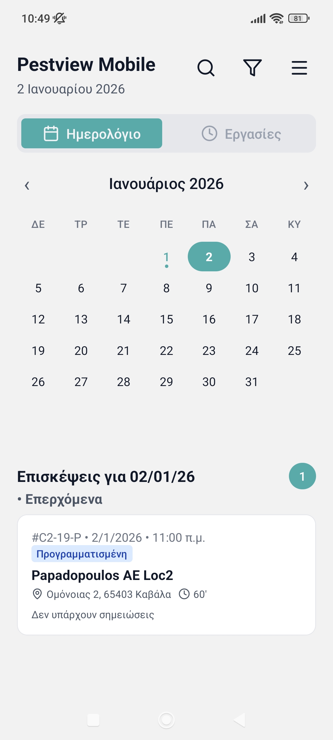 Η Καρτέλα Ημερολογίου έχει ένα μηνιαίο ημερολόγιο. Οι ημέρες που έχουν επίσκεψη είναι επισημασμένες και ο Τεχνικός μπορεί να μεταφερθεί σε όποια ημέρα και μήνα επιθυμεί. Ο Τεχνικός μπορεί να κάνει κλικ σε οποιαδήποτε επίσκεψη θέλει και στις δύοκαρτέλες και θα μεταφερθεί στην Οθόνη Πληροφοριών Επίσκεψης