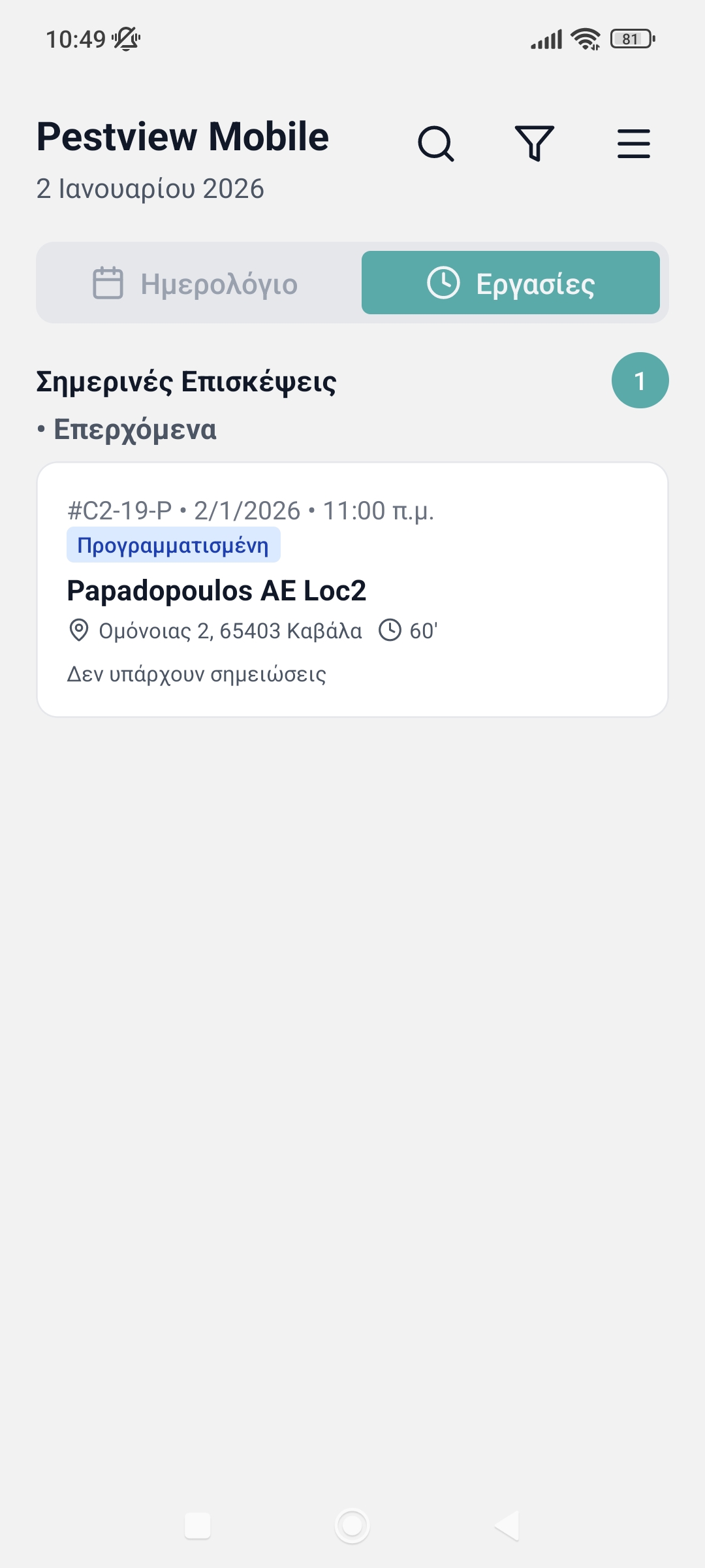 Αποτελεί την προεπιλεγμένη καρτέλα που εμφανίζεται όαν ένας συνδεδεμένος *Τεχνικός_ ανοίγει την εφαρμογή. Στην καρτέλα αυτή εμφανίζονται οι επισκέψεις της ημέρας.