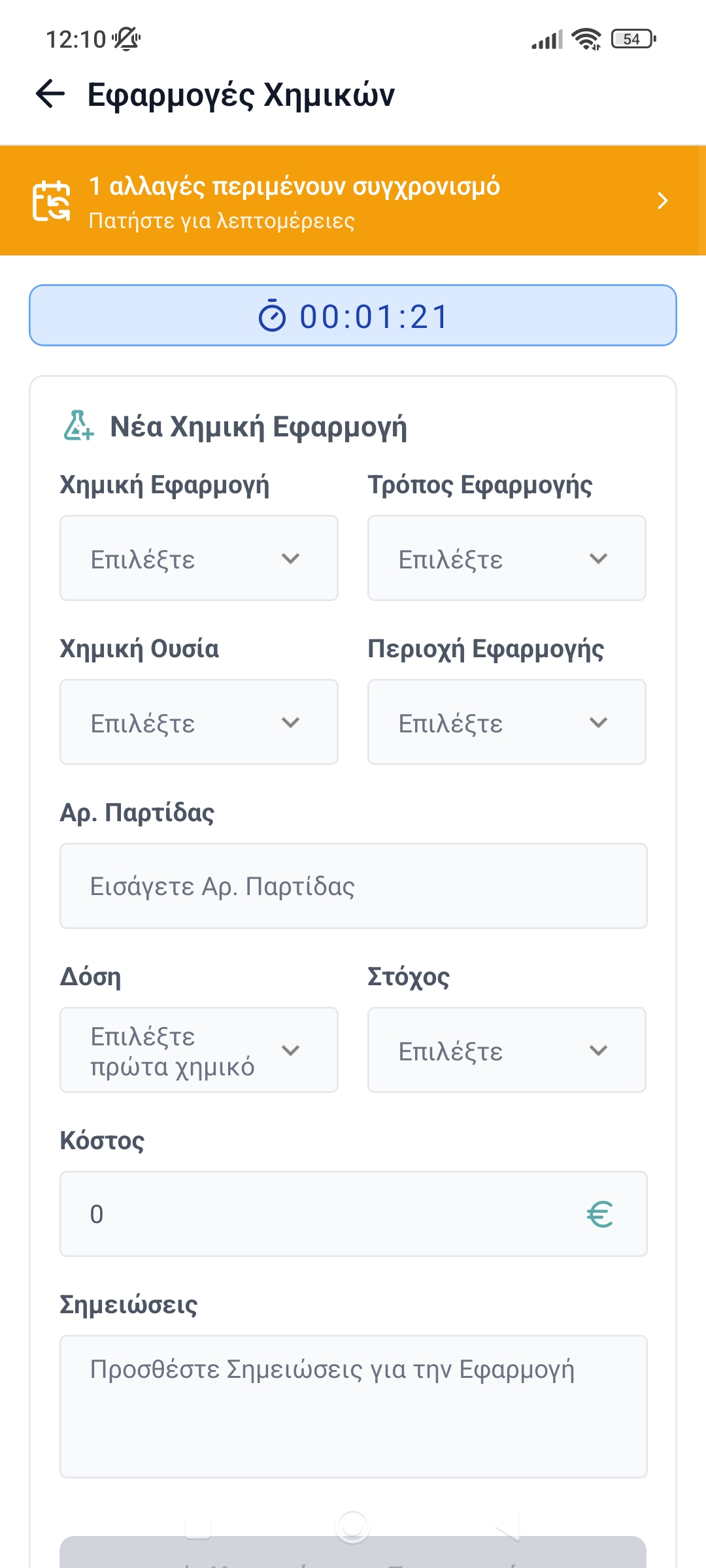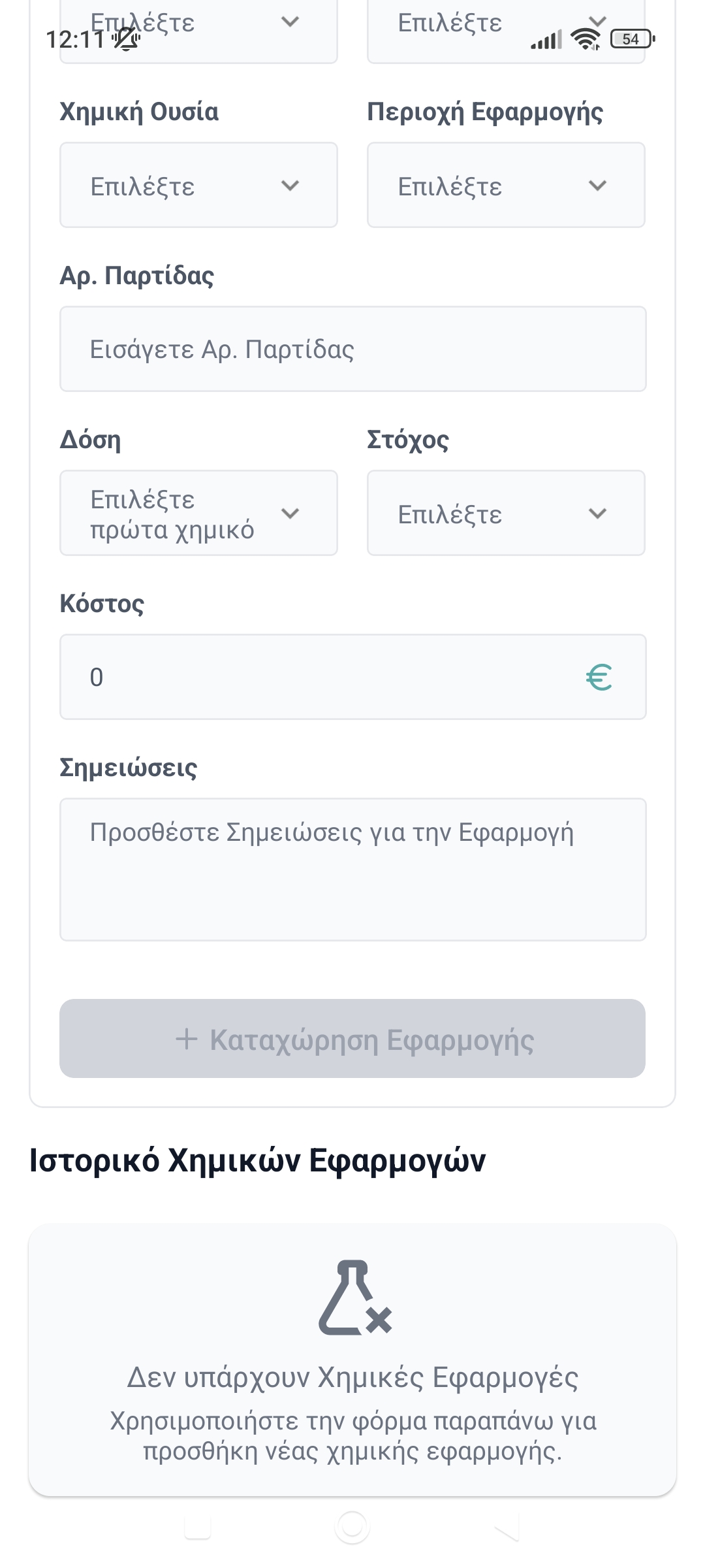 - Να προσθέσει μια Νέα Χημική Εφαρμογή από τη λίστα των διαθέσιμων χημικών εφαρμογων, συμπληρώνοντας όλα τα απαραίτητα στοιχεία στη φόρμα, προσθέτοντας επιπλέον σημειώσεις για την εφαρμογή και κάνοντας κλικ στο Καταχώρηση Εφαρμογής,