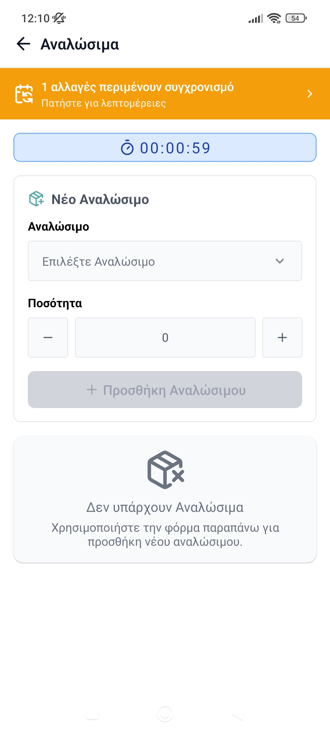 Μόλις ο Τεχνικός κάνει κλικ στο κουμπί Αναλώσιμα, θα μεταφερθεί στην οθόνη Αναλώσιμα. Εκεί μπορεί: