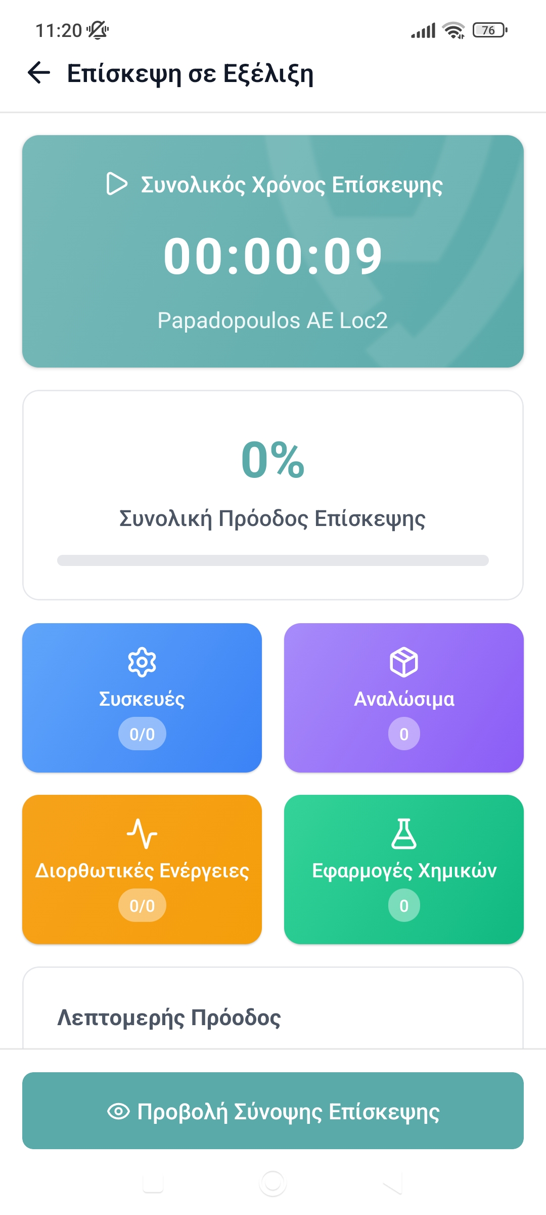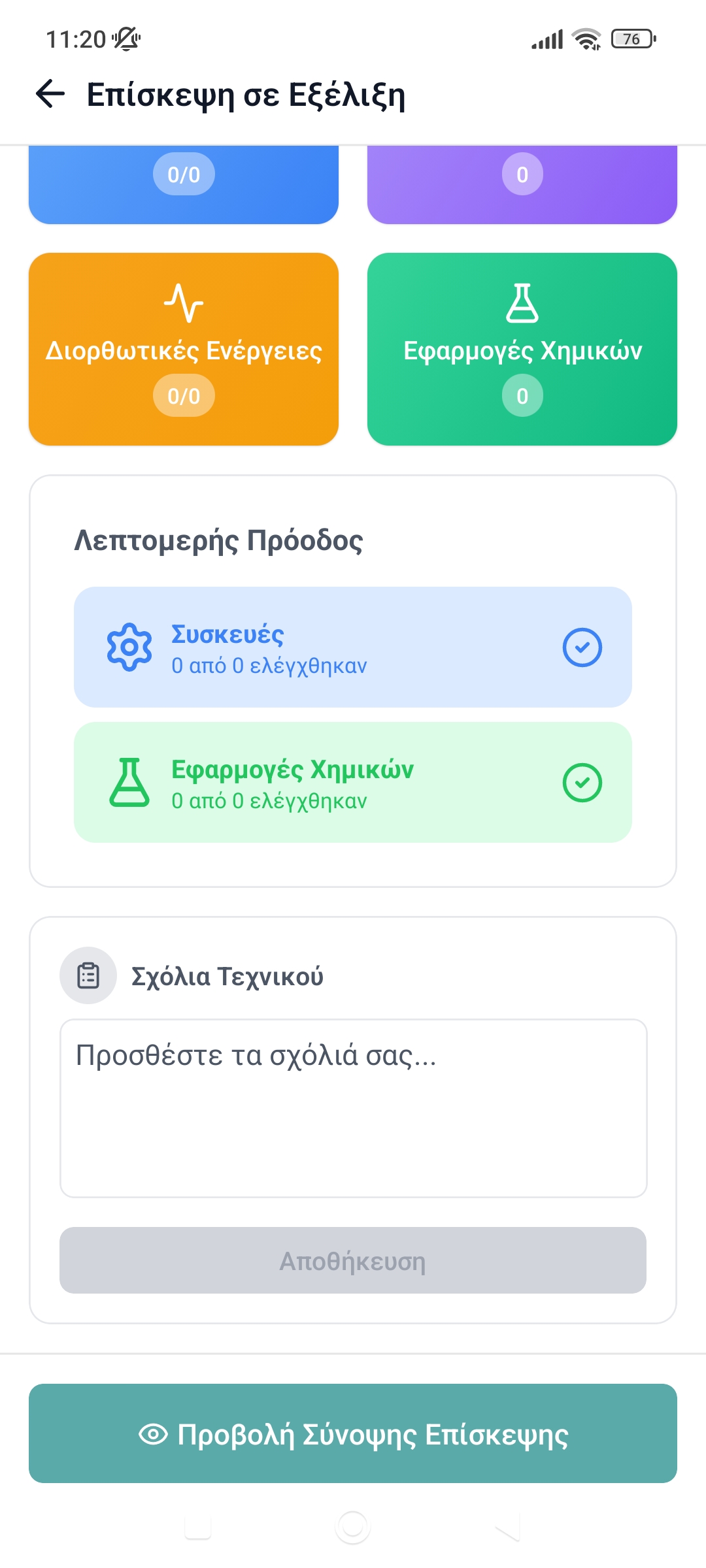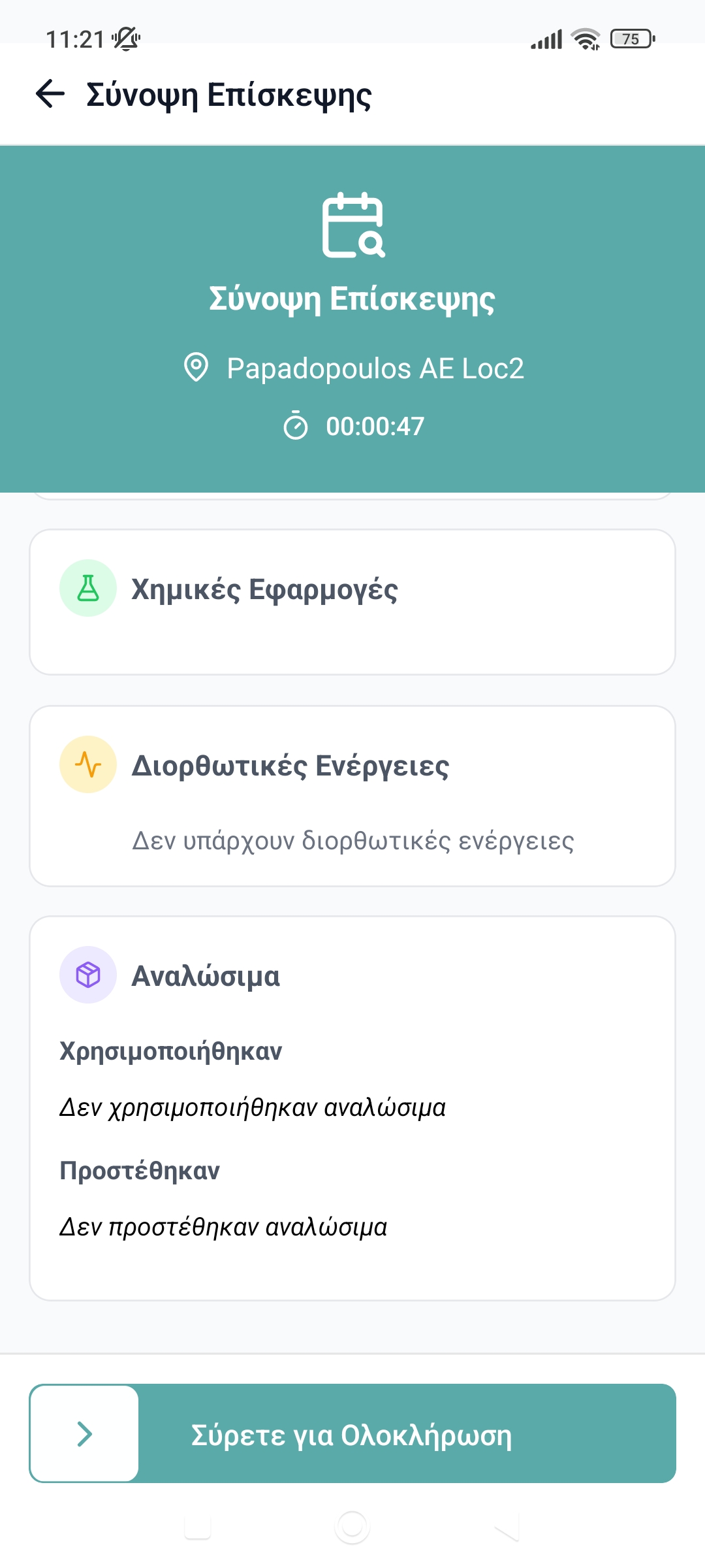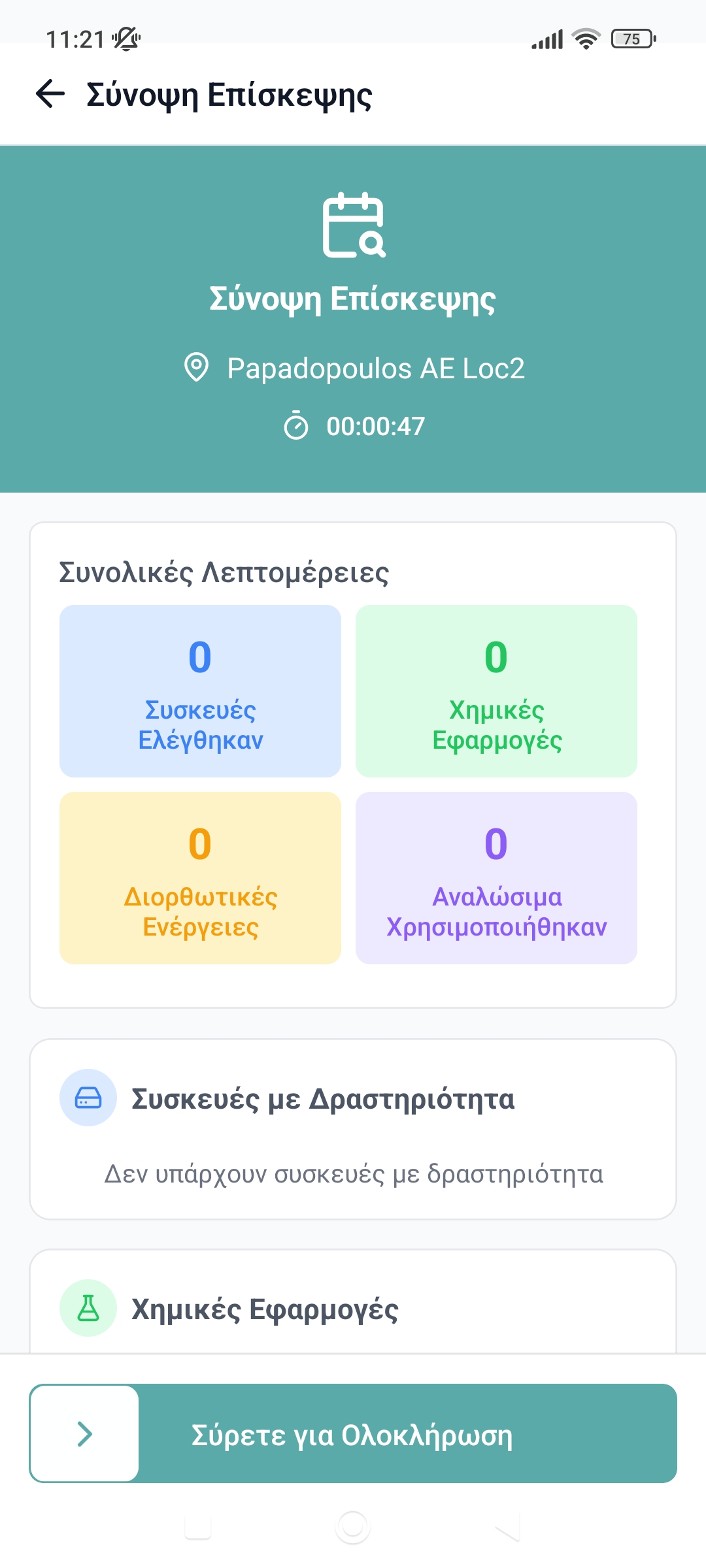 Περιλαμβάνει ποσοστά ολοκλήρωσεις για κάθε τύπο ενέργειας. Για παράδειγμα συσκευές, χημικές εφαρμογές και ούτω καθεξής. Τέλος, για να ολοκληρωθεί η επίσκεψη ο Τεχνικός θα πατήσει το κουμπί Προβολή Σύνοψης Επίσκεψης. Θα μεταφερθεί στην οθόνη Σύνοψης ΕΠίσκεψης, όπου θα εμφανιστούν οι εργασίες οι οποίες έγιναν στην τρέχουσα επίσκεψη. Για να ολοκληρωθεί η επίσκεψη απλά, στο κάτω μέρος της οθόνης Συρετε για Ολοκλήρωση.